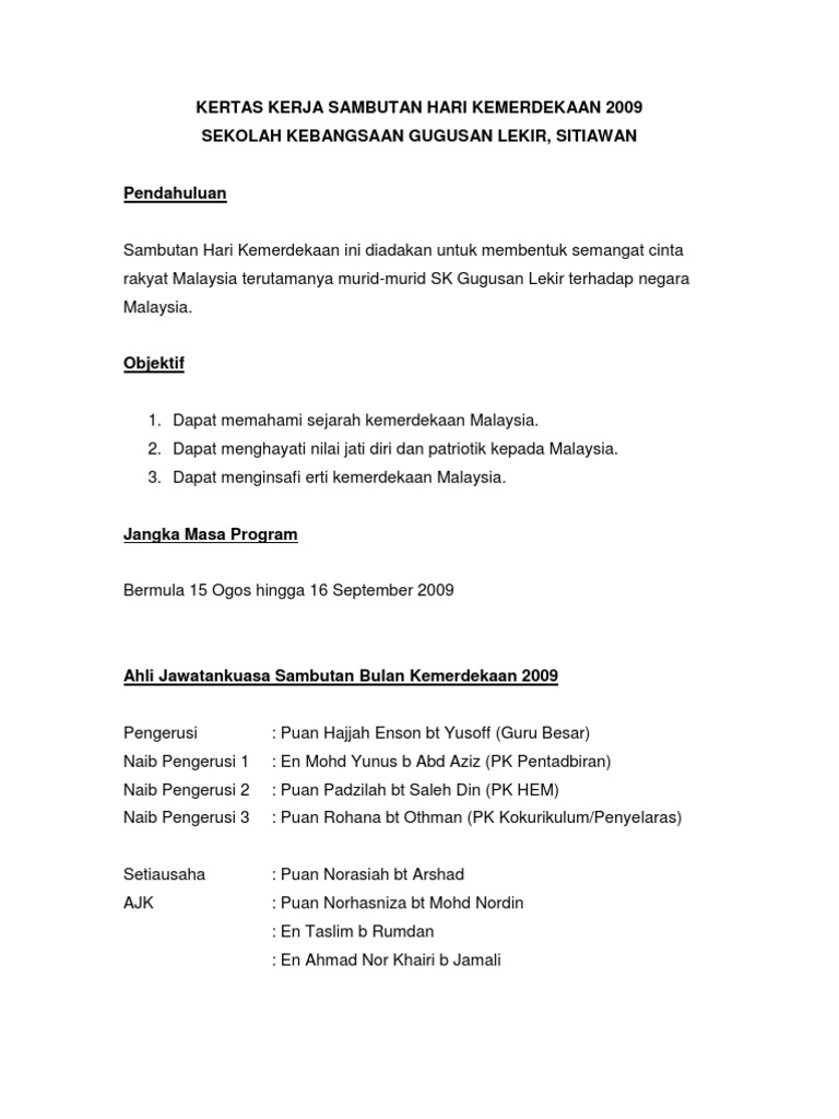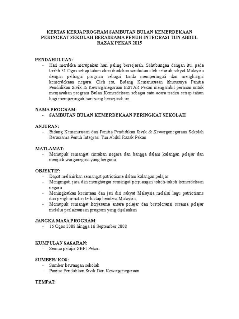 Kertas Kerja Program Sambutan Bulan Kemerdekaan Peringkat Sekolah Pdf